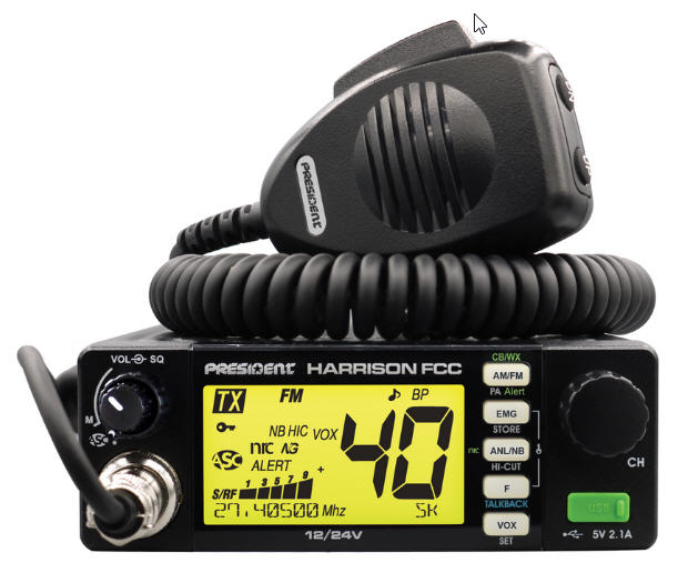 40 CHANNEL AM/FM 12-24 VOLT CB RADIO WITH USB PORT & 7 BACKLIGHT COLORS40 channel AM/FM (26.965 MHz to 27.405 MHz) CB radio features 12-24 volt operation, built-in USB port (5V 2.1A), 7 weather channels with alert, frequency display, automatic SWR, rotary channel switch, Beep function, Roger Beep, Talk-back, Tone control, volume adjustment on/off, manual & auto squelch, multi-fuction LCD display, Digital S-meter, hands free VOX operation, NRC (noise reduction), Noise Gate, ANL/NB/Hi-Cut filters, CTCSS/DCS, channel scan with skip function, 2 emergency pre-sets, F-function key, keylock, rear speaker and PA jacks. 6 pin front mount Electret/Dynamic microphone with up/down channel buttons. Approximate radio dimensions: 4.92 x 6.49 x 1.77 inches 125 x 165 x 45 mm.