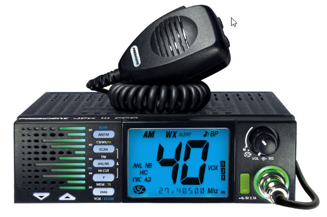 40 CHANNEL MOBILE CB RADIO WITH 7 COLOR DISPLAY, WEATHER, SWR, VOX & USB PORTOEM Truck Size - AM/FM (26.965 - 27-405 MHz 40 Channel CB Radio with front USB Type-A Port, front flashing speaker (Red/Green) indicated Transmit/Receive, front Up/Down microphone control with front mount mic jack. Features 7 color LCD display, Dual Watch, Channel scan, Memory, Weather with Alerts, Talk-back, Roger & Key Beep, automatic SWR, SWR Meter, 5 memory channels, 2 programmable emergency channels, Scan/Scan Skip/Dual Watch, ANL/NB/Hi-Cut/NRC/NG filters, manual and auto squelch, Dimmer, Vox hands free, rear Vox, PA, and external speaker jacks. Dimensions: 7.28" (W) x 6.89" (D) x 2.24" (H).